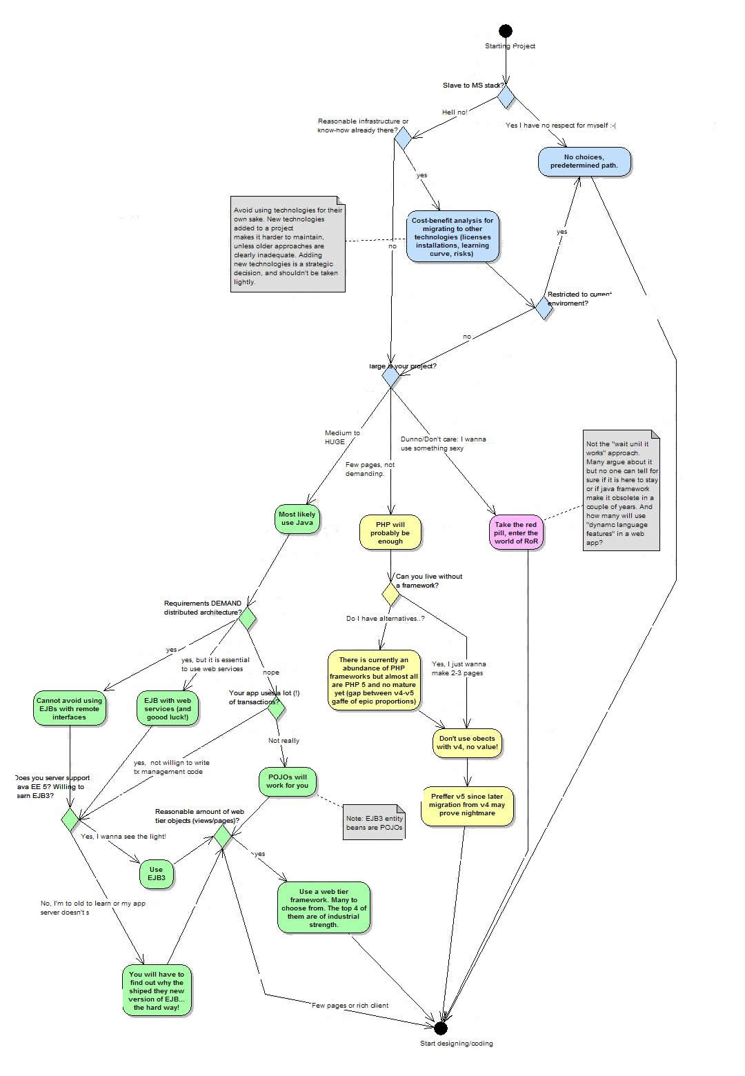 Discussions about which servers-side platform is better for web development are common in my workplace. Since I don’t like to repeat myself I have made this activity diagram that shows a simple overview of the process of choosing a platform for a web application. The bottom line is that there is no “swiss army knife” for this genre of applications. Every project should be approached independently and the architectural choices must be based on its requirements (and not your resume).